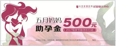为了帮助广大不孕女性成功孕育新生命,早日过上人生中第一个母亲节,北京家圆医院特推出“五月妈妈加油站,母亲节助孕在行动”活动,凡在活动期间内符合活动条件的患者,即可获得一份价值500元的助孕金券作为节日回馈。